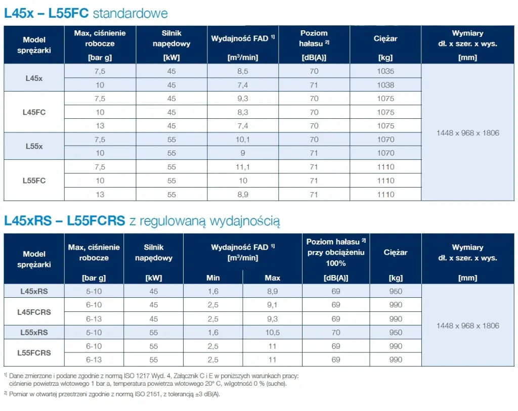 W serii L45 do L55 kW występują zarówno sprężarki stałoobrotowe, jak i modele zmienoobrotowe z falownikiem. To ważne, bo sposób doboru dla obu grup nie jest taki sam. W praktyce oznacza to, że najpierw trzeba ustalić rodzaj sprężarki, a dopiero potem porównywać parametry z tabelą.